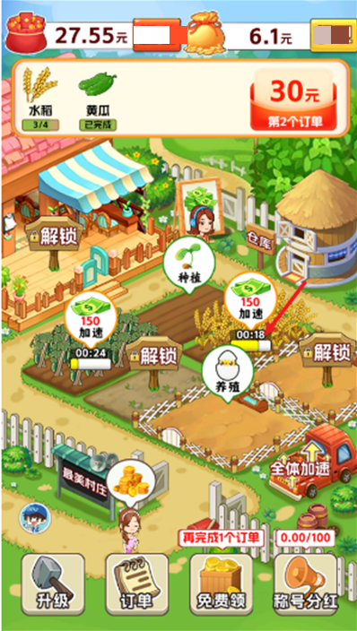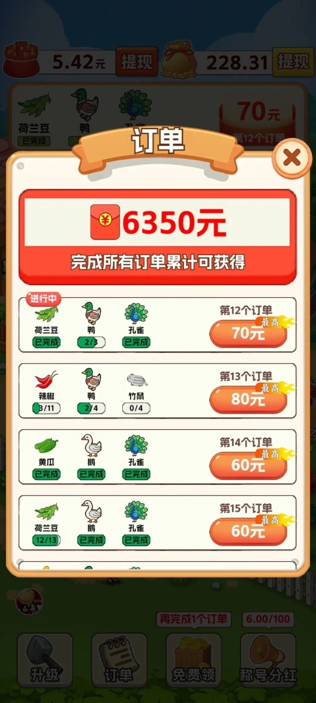 2、在游戏中完成各种各样的订单任务获取红包奖励