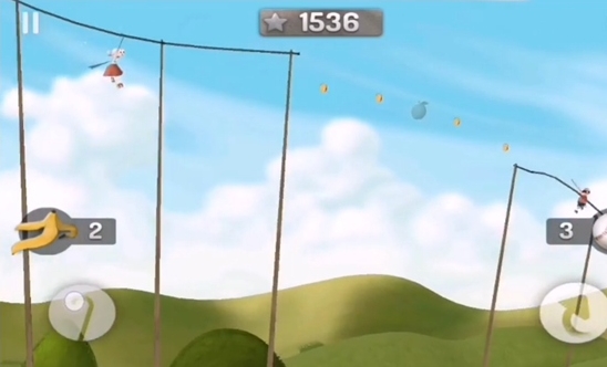 游戏的页面非常简洁,左边的拐杖按键是用来钩挂缆绳或者凸起物,在游戏中后期难度提升时会加入这个元素。