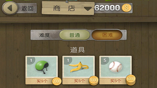 游戏中获得到的金币可以用来购买各式道具,头盔可以抵消头着地受到的前进暂停状态,香蕉皮可以向后扔使后面追逐的人摔倒。