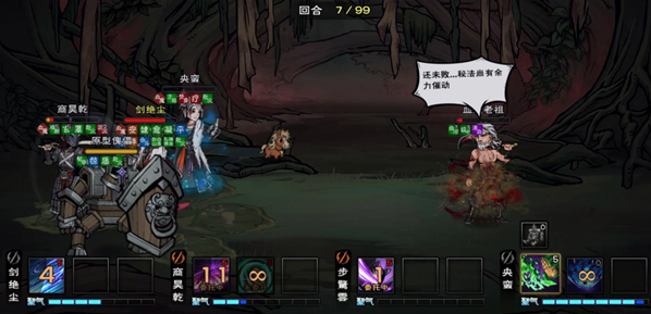 5、进入二阶段后全力输出,把血魔老祖的血量打到他的名字血字下面,然后把控回合,在回合初的时候主t点击傀儡和青蛾,此时最好三个随从要储存两个技能,然后平A或者放一个技能把他打出三阶段,留一个技能打出换血,换血如果青蛾随从没有死的话,必定换青蛾的,也就是一点血不换,此时基本上稳了,如果青蛾随从在换血时提前没了,就表示此时要换第二高根骨人物的血量了。