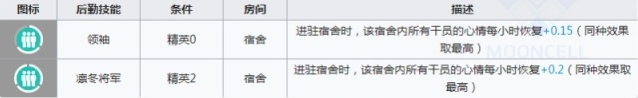 凛冬的基建技能是宿管类技能,可以在平时让凛冬当个加速心情回复的宿管,或者也可以放在会客室来提高线索4,也就是是乌萨斯学生自治团的线索获取几率。