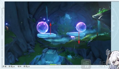 7、当水泡与簧管齐平时(且右边的平台正在下降),玩家可以使用弓箭攻击左边的水泡即可(右边正常会被波纹引爆,没有就补一箭),然后引导第三个仙灵;
