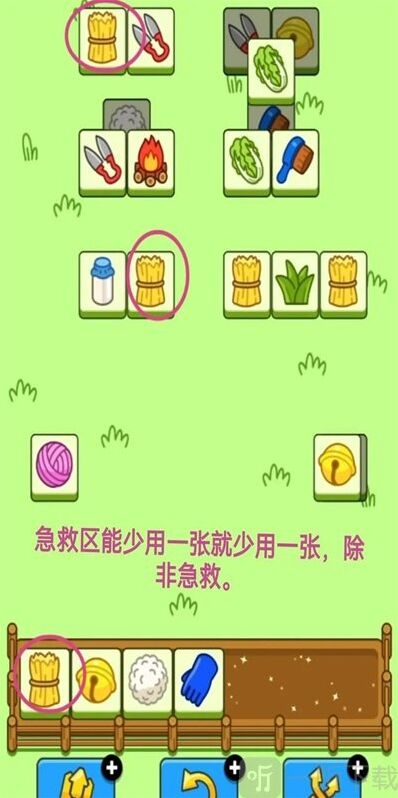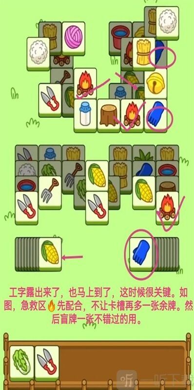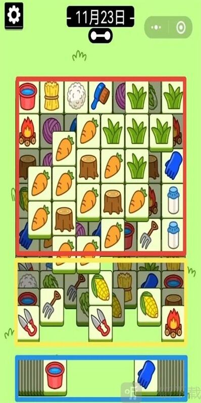 第二步:工字的消除。两个工字大部分都能配合得上,这部分主要是盲牌的使用,一旦主攻区出现,盲牌的一 缺的 二,优先盲牌消下去。盲盒不能在消除时落下,容易卡牌。