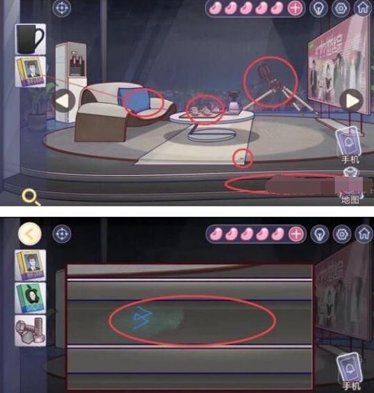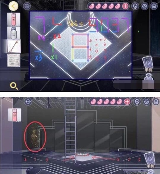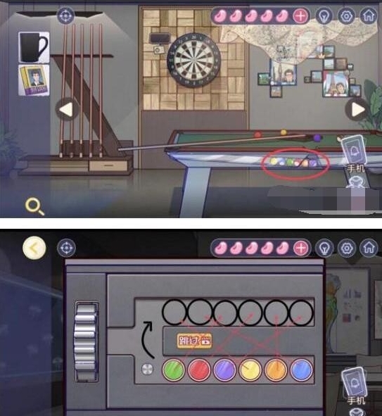 8、按钮3:电脑桌右下方有密码暗柜,查看台球桌上的菱形框得到密码2919,得到齿轮,将齿轮装在热力图旁边的仪器上,根据台球桌下网袋里的台球颜色得到仪器按钮颜色顺序黄蓝绿红橙紫,拖动不同颜色按钮调整顺序,成功后得到音符箭头按钮。
