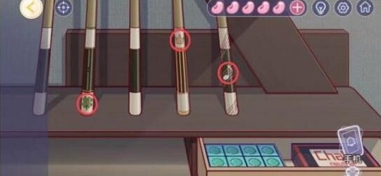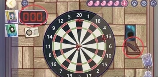 6、按钮2:在会议室座位上找到飞镖,按规则扔飞镖消除120分,完成后得到柜子把手,将把手安装在台球杆架右下方的柜子上,得到巧粉。