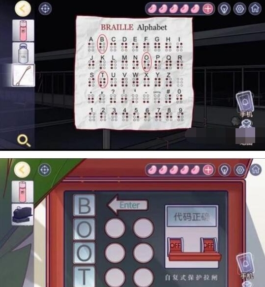 18、回到走廊,在警报器上安装好SOS按钮,按照密码纸得到密码BOOT,对应的图案如图,往下拉闸成功恢复警报器。