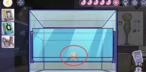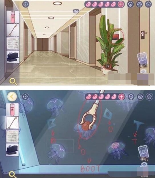 17、前往走廊,找到除水母荧光粉,去Mr、Chu办公室的鱼缸,使用除水母荧光粉,用夹子夹起SOS按钮,玻璃上得到密码BOOT。