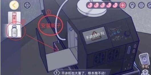15、观察舞台显示的数字,得到密码0379,得到轮子,观察舞台火焰喷射顺序,按顺序摁舞台上的火焰图标,得到干冰高压瓶,将干冰高压瓶和轮子安装在舞台左边的干冰机上,得到干冰机。
