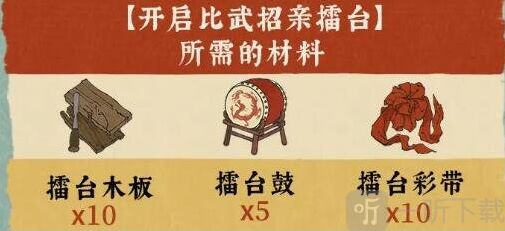 5、来到放置在城镇中的“招亲擂台”并点击,接着将修复所需的材料“擂台木板*10”、“擂台鼓*5”、“擂台彩带*10”进行提交,就能完成翻新修复,这样就可以在城镇中开启比武招亲。