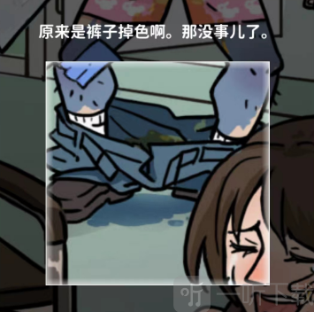 回答:点击男子耷拉在地下的裤子,原来是裤子掉色啊,那没事儿了。