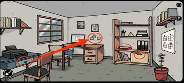 12、切换至卡丽莎来到二楼用红钥匙打开书房,先拿走书架上的A4纸和钥匙冰块,再根据抽屉以及电脑旁边的便签打开电脑。
