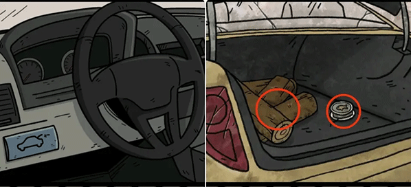 10、到车库用钥匙打开车门并打开后备箱,在副驾驶座位上有第四只收集要素,先根据车库工具墙上工具的形状打开后备箱里的盒子获得红钥匙,再切换到巴斯蒂安拿走后备箱里的木头和鱼线。