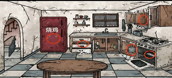 8、进入厨房搜索道具(如上图)获得烧鸡、火柴和皮皮虾,灶台下方的两个柜子可以找到第三只收藏要素和饼干提示(饼干图案和顺序)。