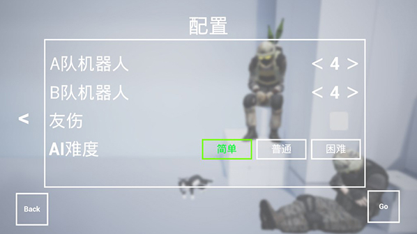 4、之后再进行游戏的配置,可以设置机器人队友和敌人的数量,以及友亡和难度,之后点击右下角go即可进入游戏。
