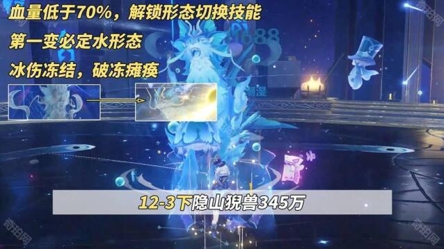 隐山猊兽345万血量,没有锁血机制,你伤害高直接一波把它带走也不是不行。正常对敌基本考虑第一个节点,血量低于70%开始切换水形态,用冰伤可将其冻结,用伤害破坏冻结还可进一步使其瘫痪倒地。
