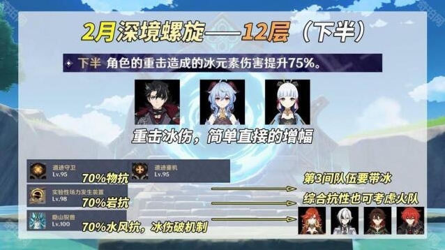 此外3间敌人分别具备‘70%物理抗性、70%岩抗性、70%风水抗性’,非高练队伍尽量避开上述提及伤害类型。并且在第3间需要队伍安排1位冰伤破除敌人机制