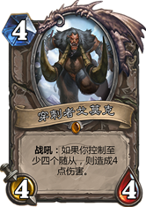 愤怒守卫是一个非常具有进攻性的随从。这个随从在标准环境出炉前并没有什么出场率,但我必须要说的是,这个2费4/3的随从确实是非常的强大。在动物园内战中,如果你能够在场面优势的情况下在2费回合拍下愤怒守卫,那么对手就会非常难以返场。