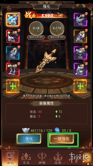 强化装备可增强攻击、血量、抗 暴等属性,当所有部位的装备均被强化后,可激活强化大神效果,使战斗力大幅提升。