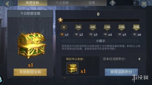 根据昨日联盟成员活跃积分总和,决定今日联盟宝箱数量,每日0点结算活跃积分。