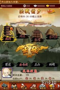 在第一次进行选择时掌门可以选择从以下四处任意一处出发,每处可为掌门增加不同属性,并且选择不同道路的掌门之间不会互相遭遇。