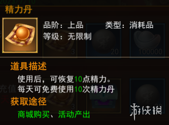 4、精力丹是恢复精力值的重要道具,使用后可恢复角色10点精力值。精力丹的获取来源包括每日累计活动以及完成江湖录任务。