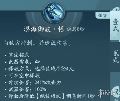 壹式施展后,五秒内可施展贰式,贰式施展后,五秒内可施展叁式。技能本身偏pvp,会存在僵直情况。秘章减伤,绝篇增伤。