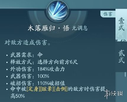 壹式施展后,五秒内可施展贰式;贰式施展后,五秒内可施展叁式,使用时会逐步提升伤害。两本秘籍均为增伤,PVE根据具体BOSS机制来选。