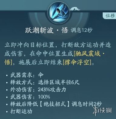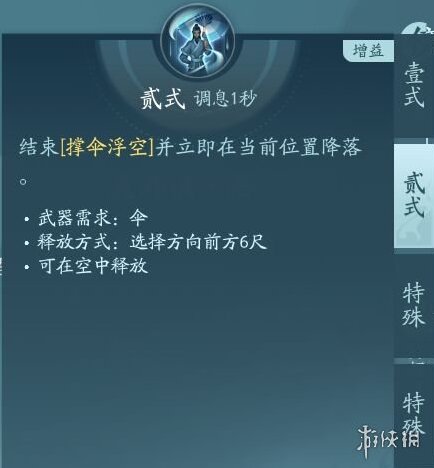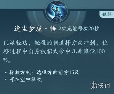 自带必选门派轻功,可在僵直中施展,位移过程中无法施展,在空中也可以使用该技能。