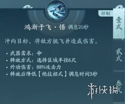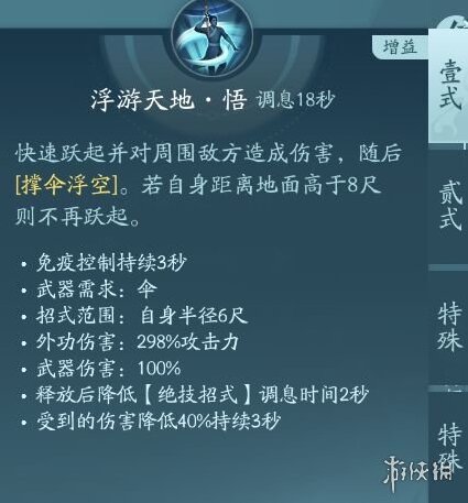 两段技能,下有特殊技能物化天行·悟同为两段技能,蓬莱的招牌技能,浮空并根据你的目前方向前进,此时可以使用门派轻功。此时若未操控方向,也会按照你的释放技能时面朝方向逐渐向前方移动,并缓慢降落,当处于撑伞的状态下,傍身技能将被替换为物化天行