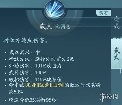 技能共有两式,主要效果在快速接近目标,其秘籍上带有的效果才是最重要的,PVP可选秘章,其绝篇释放后获得一个极高的全局增伤,且给予了充能保证长时间覆盖的机会,因此在副本中我们需要这个技能做前置和计算时间进行追加,pve可选。