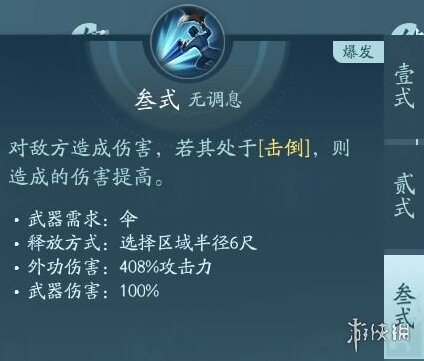 击水三千共有三式,PVP一般不选这个普攻招式,多为PVE使用,壹式贰式为三次连续伤害,叁式在施法动作结束后出伤害。