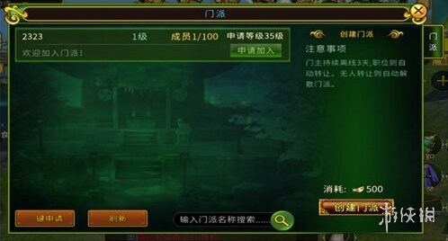 创建门派需要达到弑魔刀/至圣剑/玄武枪/穿云弓/济世者的境界,而且如果已加入其他门派,就无权再创立门派。