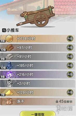 4、小推车系统:即离线资源收益系统,前期资源相对充裕,因此可以先将资源等级平均提升,大约到第三天时,开始重点提升木材和石块的等级,否则其他资源升级材料可能会不足。