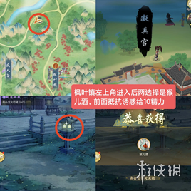 6、进入枫叶镇左上角后,选择猴儿酒,前面抵抗诱惑可获得10点精力。
