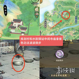 2、前往练剑村与水韵驿站之间的寺庙,可获取紫色功法凌波微步。
