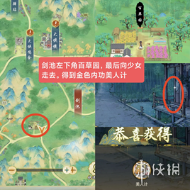 3、剑池左下角百草园,最后走向少女,可获得金色内功美人计。