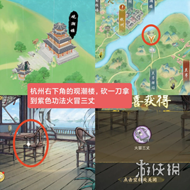 1、在杭州右下角的观楼处,砍一刀即可获得紫色功法火冒三丈。