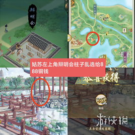 7、姑苏左上角辩明会,柱子旁乱选可获得888铜钱。