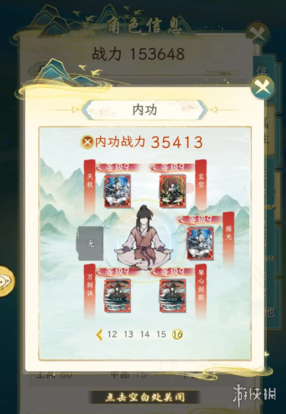 3、进行功法参悟,即升星,快捷参悟的方法为点击左上角头像下方的变强武学提升武学升重。