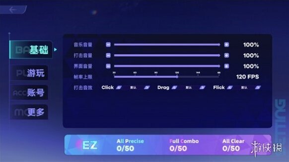4、在设置面板中可自定义音乐音量、帧率上限及打击音效等参数。