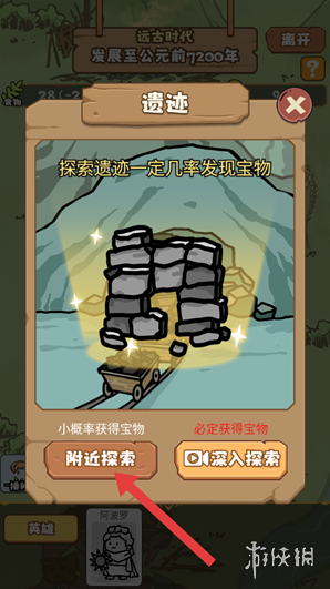 3、通过遗迹交互面板选取周边勘察指令,支付相应物资后开启寻宝概率事件。