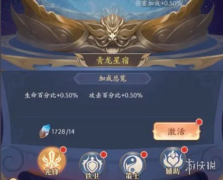 1、青龙、白虎、朱雀、玄武四个星宿台分别对应先锋铁卫、策士、辅助4个职业,星宿台激活后,可为对应职业的武将带来属性加成。