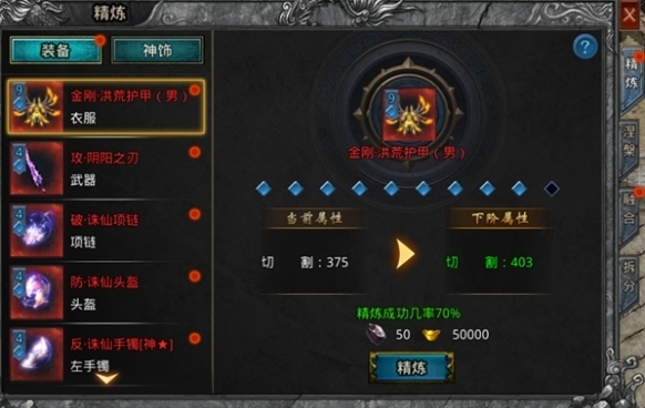 精炼顾名思义,便是利用装备回收或熔炼获取的材料对装备进行精炼,提高装备的属性。
