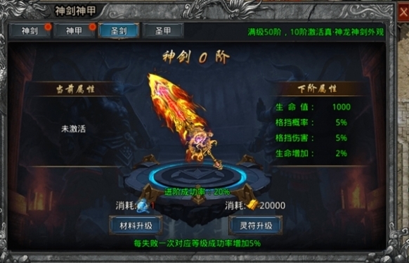 开服时间的增加,还会开启圣剑圣甲的升级路线,除基础属性外获取格挡以及闪避属性。