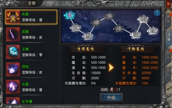 消耗涅槃材料对装备部位进行提升,除了固定的属性外还会百分比提升穿戴装备的基础属性。