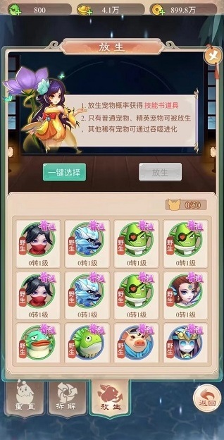 宠物放生有概率获得技能书道具,但只有普通宠物和精英宠物才能放生。