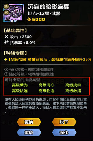 2、装备技能在装备强化至+12后会在以下装备技能中随机获得1个