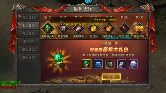 4、每日登录可领取豪华大礼包,累计登录的天数越多,获得的奖励越丰富。