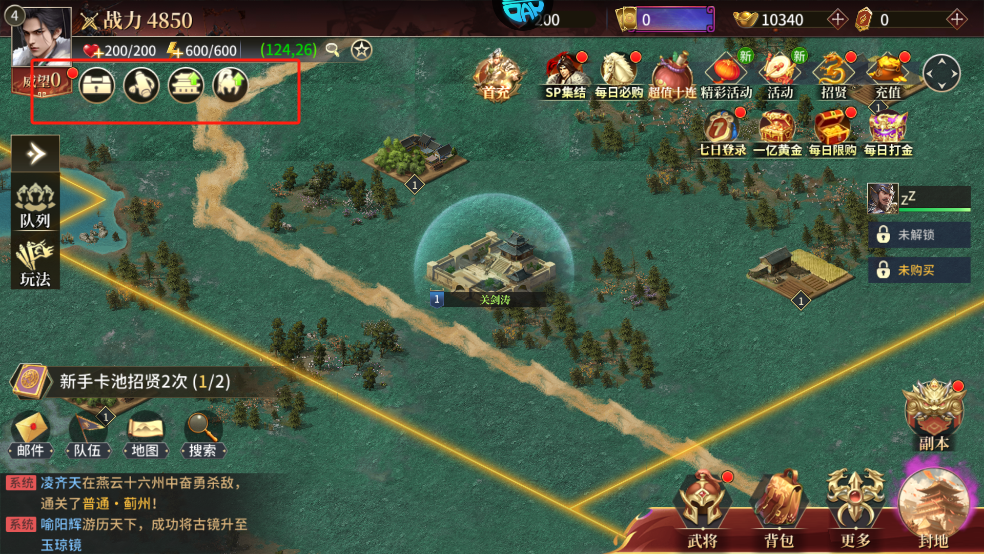 刚进入游戏推荐玩家以升级主角等级开启更多功能为主要目标,这边推荐玩家优先推进主线副本,并且根据主界面的任务提示完成任务获取强力武将角色和任务奖励。