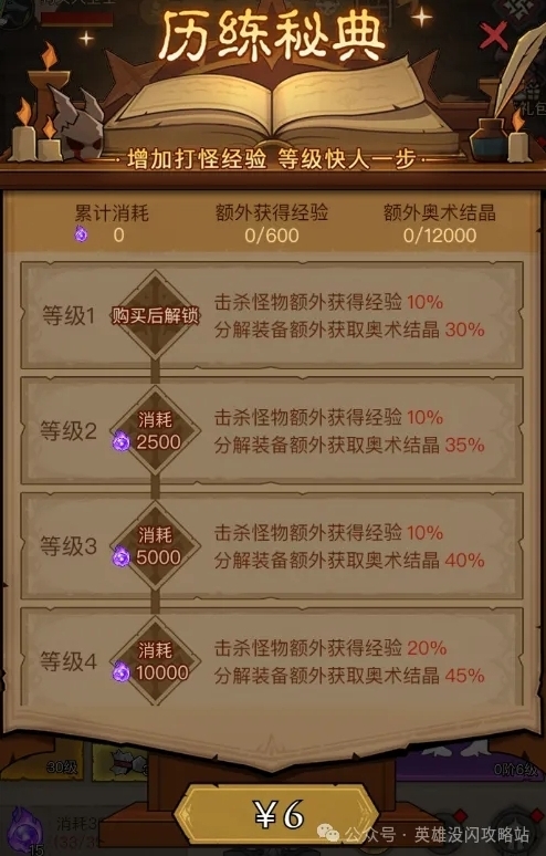 4、最后介绍的是历练秘典,历练秘典价值6元,付费解锁后可通过不断消耗混沌石来提高历练等级。历练秘典等级的提升会提高刷怪获取的经验和分解装备所得奥术结晶的数量,可谓是居家必备,刷怪首选的优质礼包。